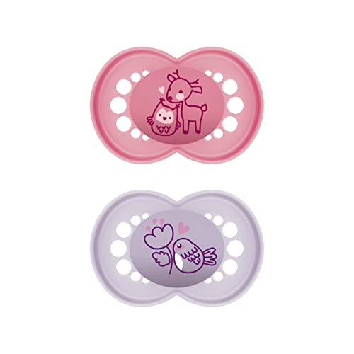 MAM Original Soothers Lot de 2 tétines de 0 à 6 mois, livrées dans un étui de stérilisateur, matériaux durables, accessoires pour bébé pour nouveau-né, rose/violet (différents modèles)