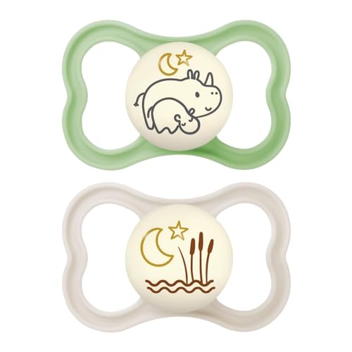 MAM Air Night, lot de 2 tétines, MAM de 6 à 16 mois, phosphorescentes dans l'obscurité, pour peaux sensibles, accessoires pour bébé avec tétines en silicone et porte-tétine, neutre, vert