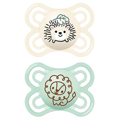 MAM Perfect Lot de 2 tétines, pour un développement sain des dents et de la mâchoire, en matériaux durables et biologiques renouvelables, avec boîte à tétine, pour bébé de 0 à 6 mois, hérisson/lion