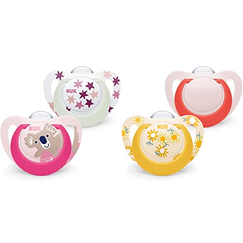 NUK Star Lot de 2 tétines pour bébé | 18-36 mois | Tétines jour et nuit | Silicone sans BPA | Koala rose & Star Lot de 2 tétines en silicone sans BPA pour bébé de 18 à 36 mois Motif fleurs jaunes