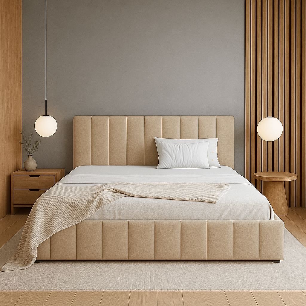 GUTTO Lit capitonné KARAMELL 140x200 sommier à lattes en boisTexte velours beige sans grille ni espace de rangement