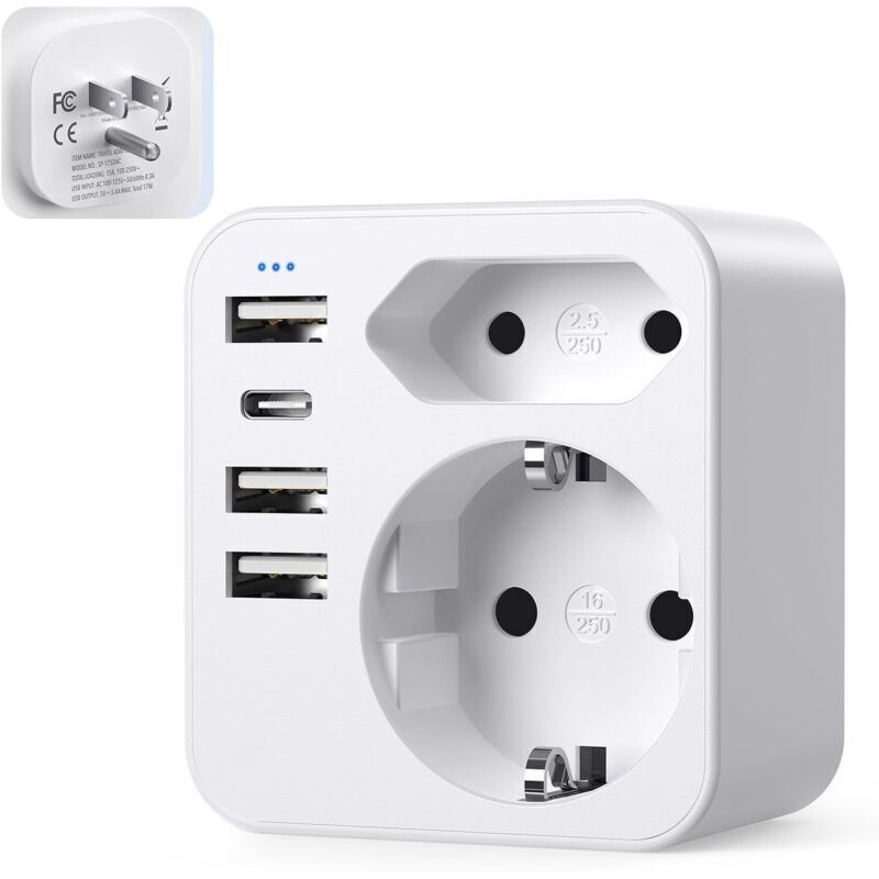 GUNGY Adaptateur de voyage universel Blanc 3 USB + 1 USB-C Adaptateur Europe vers US pour États-Unis Canada Mexique Thaïlande Type B