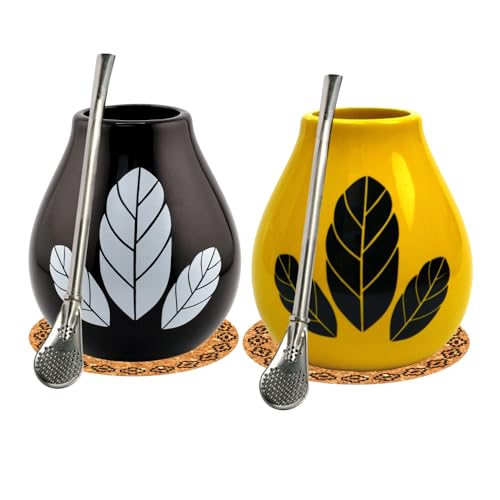 Lot de 2 tasses à thé maté en céramique Hoja Yellow et Hoja Black 350 ml ● Paille Bombilla et cocrpad ● Bombilla et tasse à thé mate en acier inoxydable