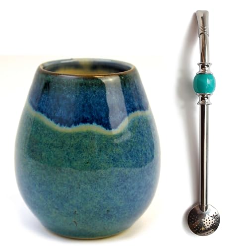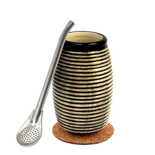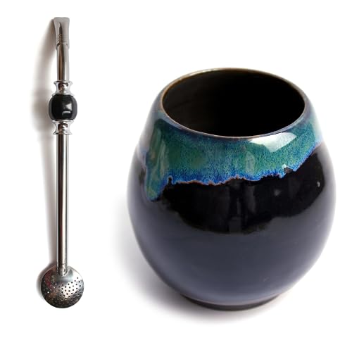 Yerba Maté Set | Tasse à thé mate en céramique faite à la main ~ 300 ml | Unique matero | Passe au lave-vaisselle | Paille en acier inoxydable Bombilla Bola noire pour maté 21 cm | Set pour yerba maté
