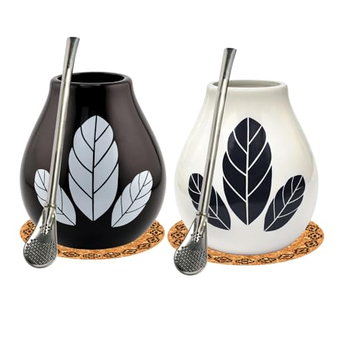 Lot de 2 tasses à thé maté en céramique Yerba mate Hoja Calebasse 350 ml ● Bombilla en acier avec anneau de refroidissement en acier inoxydable ● Tampon en liège ● Kit de démarrage pour deux
