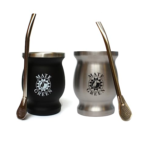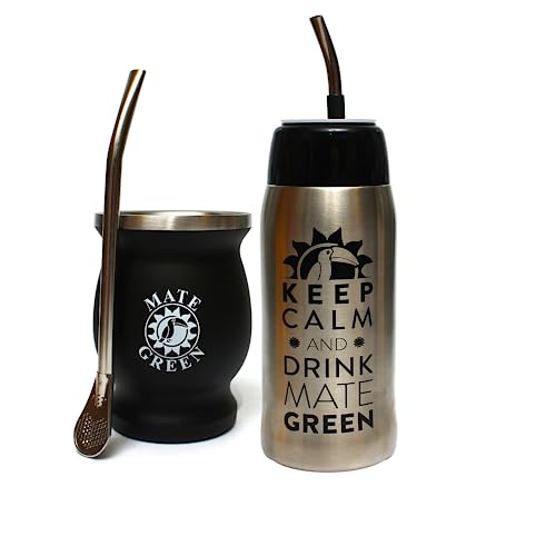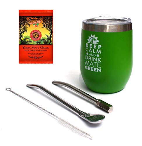 Yerba Set à thé | Tasse à maté à double paroi en acier inoxydable « Verde » | Deux bombillas (paille) pour maté | 50 g de thé vert maté | Brosse de nettoyage
