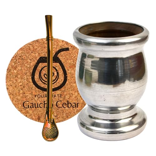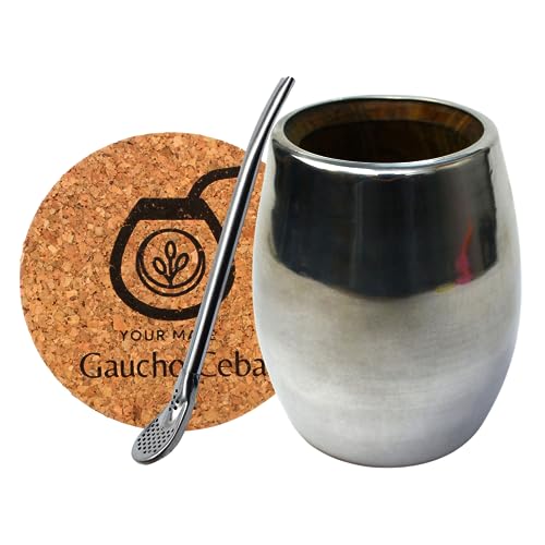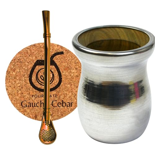 Gaucho Cebar Ensemble pour thé Yerba Maté | Tasse à thé Palo Santo entièrement en métal habillée | Paille Bombilla pour maté 15,5 cm | Tampon en liège | Set pour thé yerba maté