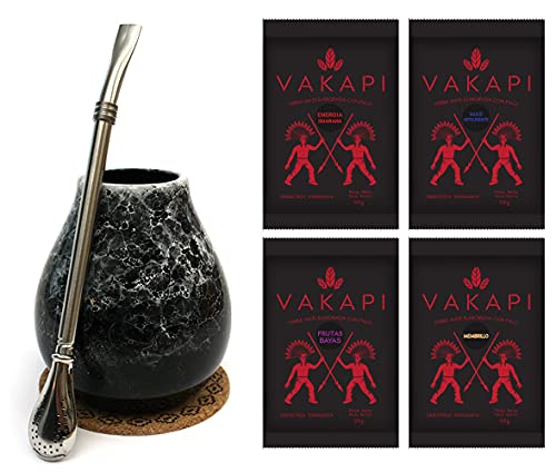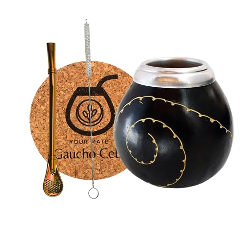 Gaucho Cebar Set pour thé yerba maté avec calebasses naturelles, tasse à citrouille et paille bombilla en acier inoxydable, paille pour thé yerba maté, brosse et dosette en liège, noir