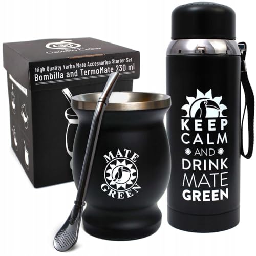 Gaucho Cebar Kit d'accessoires pour thé Yerba Maté | Gobelet isotherme à double paroi en acier inoxydable noir – Bouteille isotherme noire – Paille Bombilla
