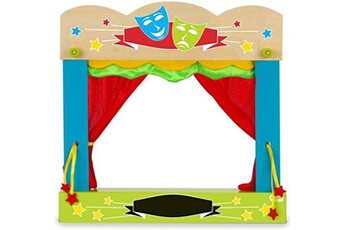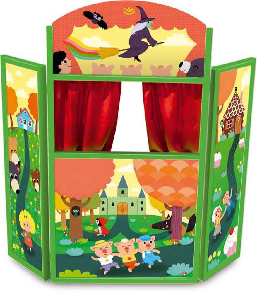 Théâtre de marionnettes en bois et tissu - ROBA - Avec 6 marionnettes à main - Rouge / Bleu / Orange
