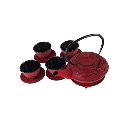 lachineuse - Service à Thé en Fonte Dragon Chinois - 1 Théière, 4 Tasses en Fonte & Filtre Infuseur - Capacité 0,8L - Décoration Japonaise Asiatique - Idée Cadeau Vaisselle Japonaise - Coloris Rouge