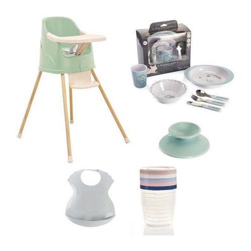 Chaise haute évolutive en rehausseur de chaise + Coffret vaisselle + Boîtes de conservation + Bavoir semi-rigide