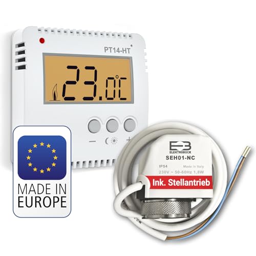 ELEKTROBOCK PT14-HT-SEH Thermostat d'ambiance + servomoteur NC - Système de protection contre le calcaire - Pour chauffage au sol à eau - Aucune programmation nécessaire - Écran LCD rétroéclairé - PWM