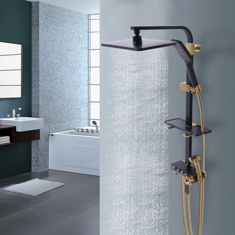 Gojoy - Colonne de Douche Moderne Montage Mural Thermostat Noir + Or Robinet De Douche Robinet Ensemble De Douche Pluie Douche à Main