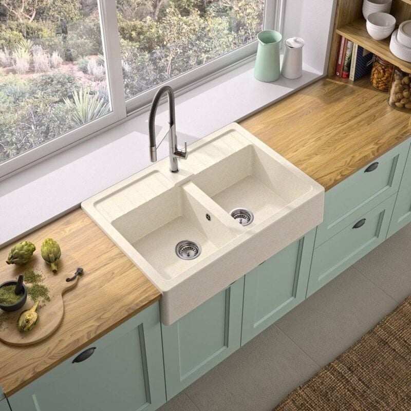 Évier timbre d'office granit blanc cassé Kümbad KIWI 2 bacs