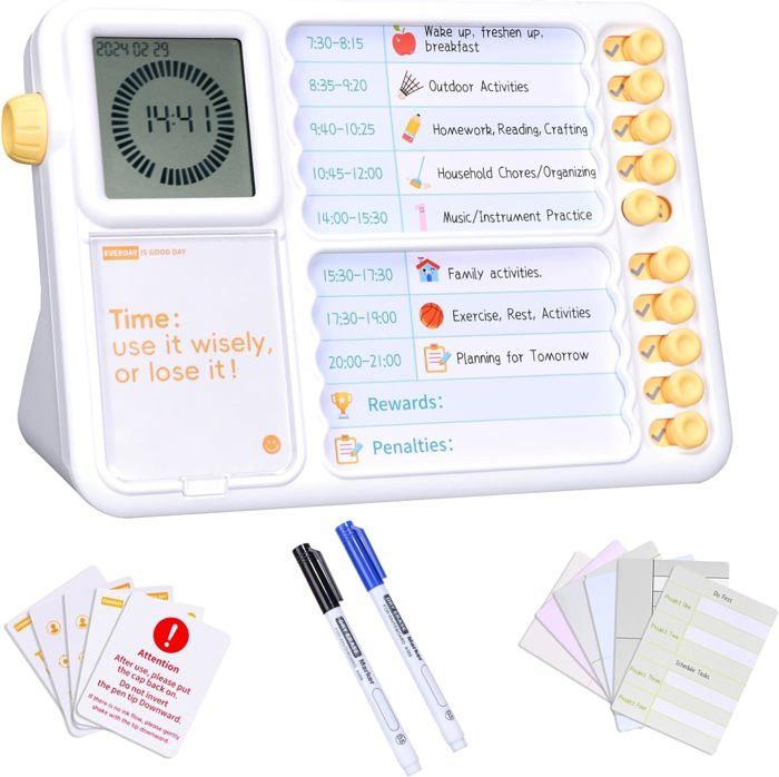 AuyKoo Minuteur Visuel Timer Enfant TDAH Outils avec Planning Semainier to do List Tableau, Pomodoro Time Digital avec Alarme, Horloge, Chronomètre Fonctions (Blanc)