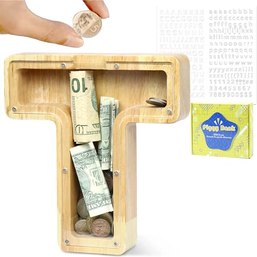 LEcylankEr Tirelire Personnalisée pour Enfants avec Lettres de A à Z en Bois Transparente - Décoration Créative - Cadeaux pour Anniversaire, Noël, Thanksgiving (T)