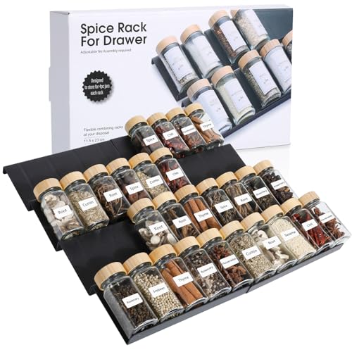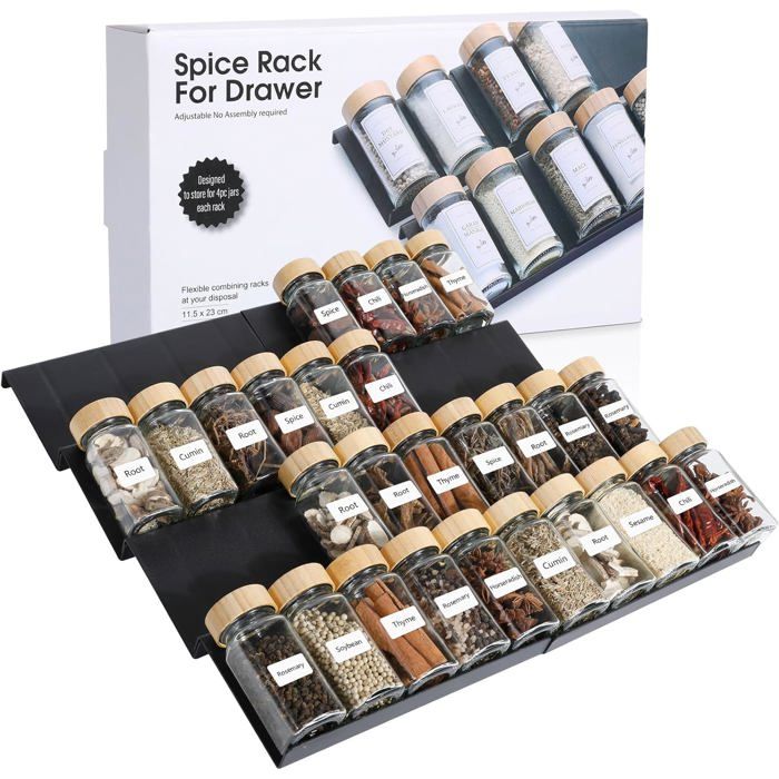 Deco haus Étagère à épices avec pots [avec 24 pots à épices et étiquettes] – Étagère à épices extensible – Tiroir de rangement à épices – Insert de tiroir à épices – Organiseur à épices