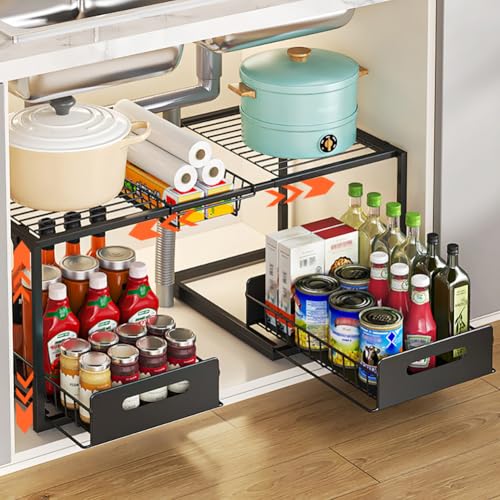 Wclavion Rangement sous Évier - Organisateur Cuisine 2 Niveaux avec Tiroir Coulissant | Rangement Placard & Organisation Cuisine | Meuble sous Lavabo Multifonction(Black,2pcs)