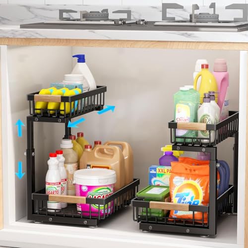VINATO Rangement sous Evier Cuisine, 2 Niveaux étagère Organisateur Coulissant, Hauteur RéGlable Tiroir, Placard Organisation Pour Salle de Bain, Salle, Meuble, Noir
