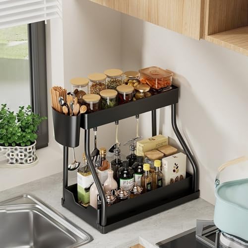Wclavion Rangement sous Évier - Organisateur Cuisine 2 Niveaux avec Tiroir Coulissant | Rangement Placard & Organisation Cuisine | Meuble sous Lavabo Multifonction(Black,1pc)
