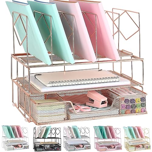 gianotter Organisateurs de bureau et accessoires, organiseur de fournitures de bureau avec tiroir coulissant, double plateau et 5 sections verticales (or rose)