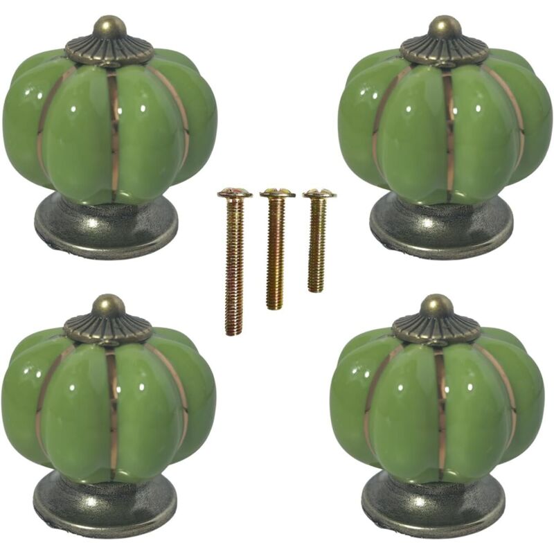 Lot de 4 boutons de tiroir céramique vintage vert pompe, poignées de meuble pour commode, armoire ou dressing, style rétro.
