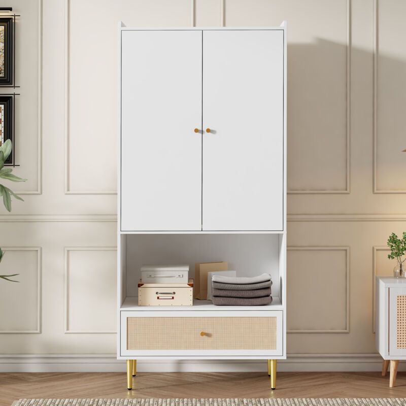 Armoire 2 portes avec grand tiroir en rotin et penderie, Meuble de rangement pour chambre et salon, Pieds et poignées en métal, Blanc, 80x48x175 cm
