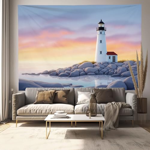 Tapisserie Murale Paysage Côtier Au Coucher Du Soleil Tenture La Grande Phare Minimaliste Deco Tenture Murale Poster 3D Effet Jaune Peinture Murales Tissu Estampes Pour Chambre Salon 230X180Cm