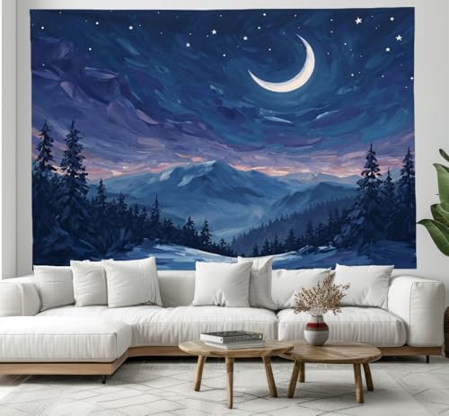 Tapisserie Murale Lune Mystérieuse Ciel Étoilé Tenture La Grande Peinture À L'Huile Forêt Deco Tenture Murale Poster 3D Effet Bleu Marine Peinture Murales Tissu Estampes Pour Chambre Salon 150X100Cm