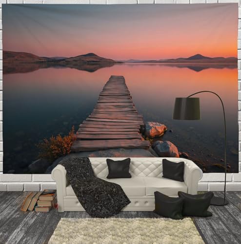 Tapisserie Murale Pont En Bois Rétro Sur Le Lac Tenture La Grande Paysage De Coucher De Soleil Deco Tenture Murale Poster 3D Effet Orange Peinture Murales Tissu Estampes Pour Chambre Salon 230X150Cm