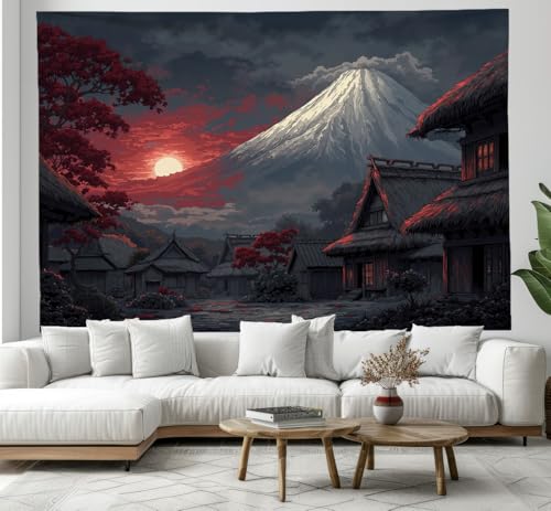 Tapisserie Murale Coucher Soleil Japonais Mont Fuji Tenture La Grande Traditionnelle Deco Tenture Murale Poster 3D Effet Rouge Noir Peinture Murales Tissu Estampes Pour Chambre Salon 230X150Cm