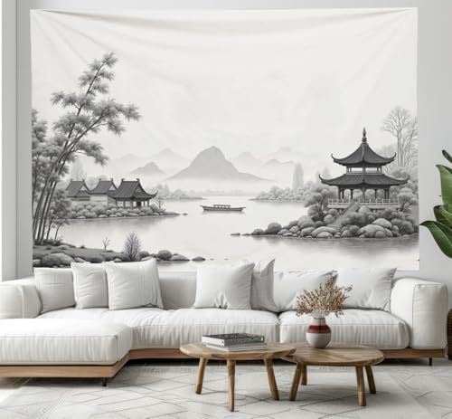 JRISEMECY Tapisserie Murale Paysage Peint À L'Encre De Chine Tenture La Grande Bambou Lac Deco Tenture Murale Poster 3D Effet Beige Peinture Murales Tissu Estampes Pour Chambre Salon 150X100Cm