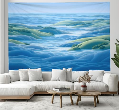 Tapisserie Murale Vagues Océaniques Abstraites Collines Tenture La Grande Affiche Paysage Deco Tenture Murale Poster 3D Effet Bleu Ciel Peinture Murales Tissu Estampes Pour Chambre Salon 200X150Cm