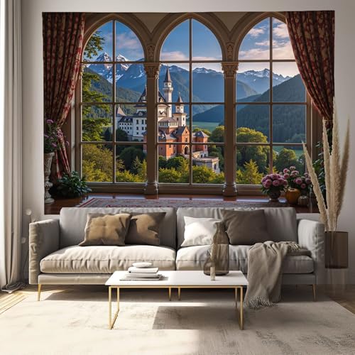 Tapisserie Murale Vue Naturelle Depuis La Fenêtre Tenture La Grande Montagnes Lacs Forêts Deco Tenture Murale Poster 3D Effet Turquoise Peinture Murales Tissu Estampes Pour Chambre Salon 100X75Cm