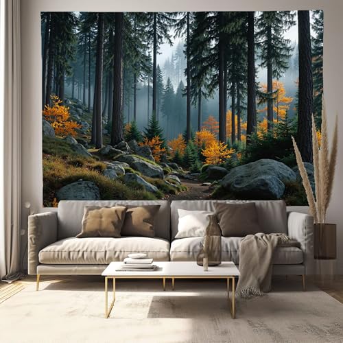 JRISEMECY Tapisserie Murale Forêt Brumeuse Naturelle Tenture La Grande Paysage Réaliste Deco Tenture Murale Poster 3D Effet Vert Foncé Peinture Murales Tissu Estampes Pour Chambre Salon 200X150Cm