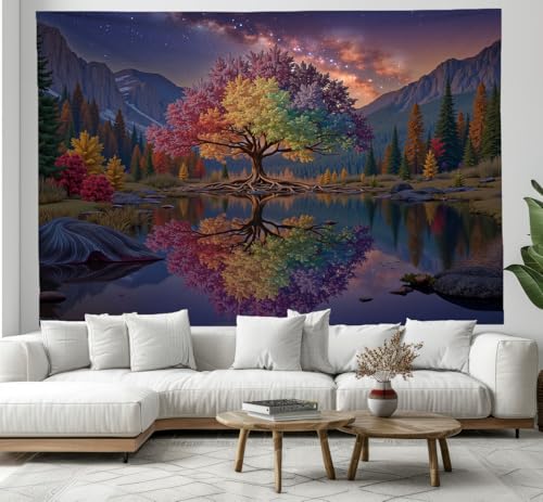 Tapisserie Murale Arbres Arc-En-Ciel Lacs Reflets Tenture La Grande Montagnes Voie Lactée Deco Tenture Murale Poster 3D Effet Bleu Profond Peinture Murales Tissu Estampes Pour Chambre Salon 100X75Cm