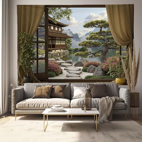 Tapisserie Murale Jardin Japonais Rétro Tenture La Grande Vue Naturelle Depuis La Fenêtre Deco Tenture Murale Poster 3D Effet Vert Foncé Peinture Murales Tissu Estampes Pour Chambre Salon 150X100Cm