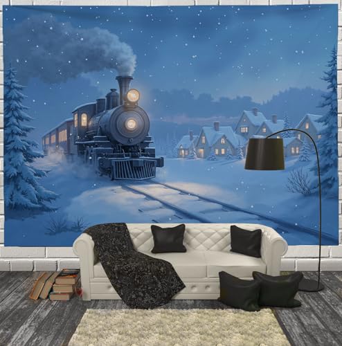 JRISEMECY Tapisserie Murale Train À Vapeur Vintage Tenture La Grande Village D'Hiver Deco Tenture Murale Poster 3D Effet Bleu Foncé Peinture Murales Tissu Estampes Pour Chambre Salon 230X180Cm