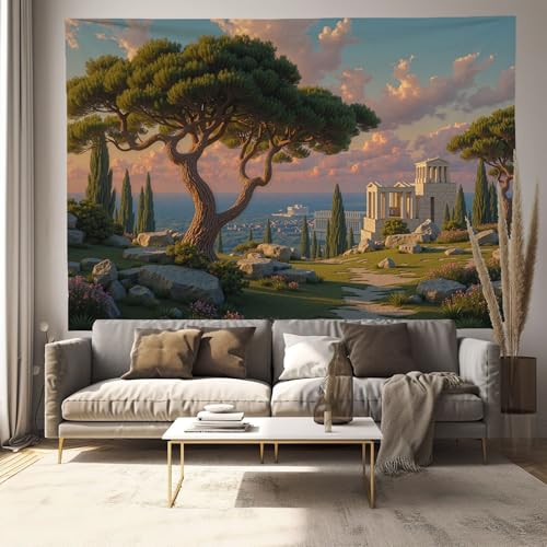 JRISEMECY Tapisserie Murale Rue Des Fleurs Grecques Tenture La Grande Paysage De Bord De Mer Deco Tenture Murale Poster 3D Effet Beige Peinture Murales Tissu Estampes Pour Chambre Salon 230X150Cm