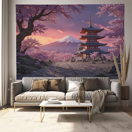 JRISEMECY Tapisserie Murale Coucher De Soleil Japonais Tenture La Grande Mont Fuji Temple Deco Tenture Murale Poster 3D Effet Rose Profond Peinture Murales Tissu Estampes Pour Chambre Salon 150X130Cm