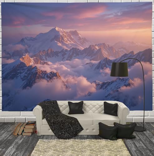 Tapisserie Murale Mer Nuages Onirique Tenture La Grande Montagnes Enneigées Naturelles Deco Tenture Murale Poster 3D Effet Couleurs Pastel Peinture Murales Tissu Estampes Pour Chambre Salon 230X150Cm