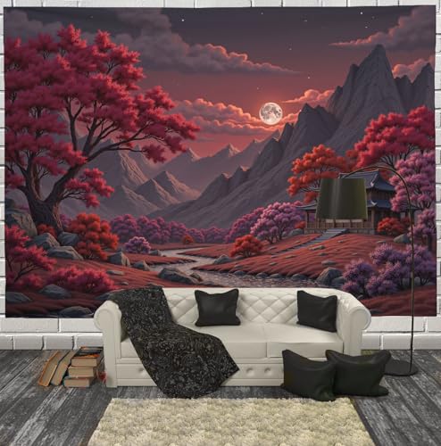 Tapisserie Murale Paysage Japonais Au Coucher Du Soleil Tenture La Grande Érables Montagnes Deco Tenture Murale Poster 3D Effet Scarlet Peinture Murales Tissu Estampes Pour Chambre Salon 230X180Cm