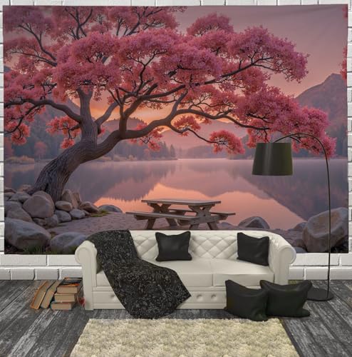 Tapisserie Murale Coucher De Soleil Fleurs Arbres Tenture La Grande Paysage Lacustre Deco Tenture Murale Poster 3D Effet Rouge Rosé Peinture Murales Tissu Estampes Pour Chambre Salon 100X75Cm