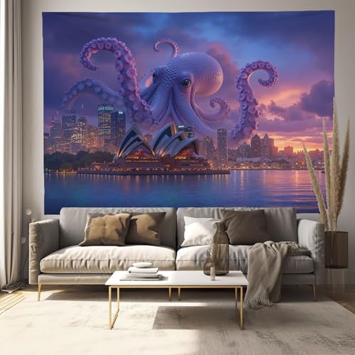 JRISEMECY Tapisserie Murale Poulpe Psychédélique Tenture La Grande Paysage D'Opéra Moderne Deco Tenture Murale Poster 3D Effet Violet Peinture Murales Tissu Estampes Pour Chambre Salon 150X130Cm