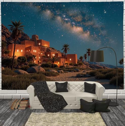 Tapisserie Murale Paysage De Village Désertique Tenture La Grande Voie Lactée Fantastique Deco Tenture Murale Poster 3D Effet Bleu Profond Peinture Murales Tissu Estampes Pour Chambre Salon 100X75Cm