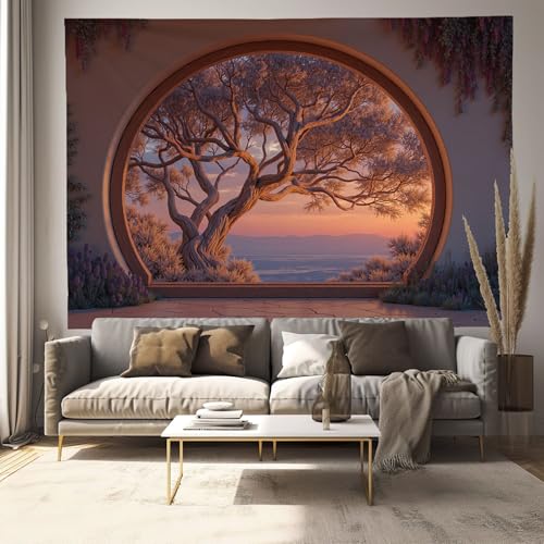 Tapisserie Murale Vue Sur La Forêt Par Fenêtre Vintage Tenture La Grande Plantes Naturelles Deco Tenture Murale Poster 3D Effet Vert Olive Peinture Murales Tissu Estampes Pour Chambre Salon 200X150Cm