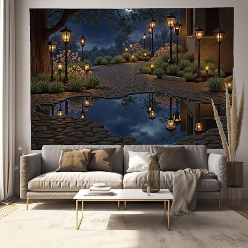 Tapisserie Murale Paysage De Café Rétro Tenture La Grande Lac Sous Le Ciel Nocturne Deco Tenture Murale Poster 3D Effet Turquoise Peinture Murales Tissu Estampes Pour Chambre Salon 200X150Cm