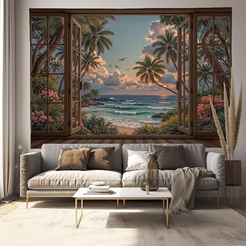 Tapisserie Murale Plage De Forêt Tropicale Tenture La Grande Vue Naturelle Par La Fenêtre Deco Tenture Murale Poster 3D Effet Brun Peinture Murales Tissu Estampes Pour Chambre Salon 230X180Cm