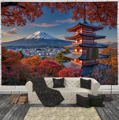 JRISEMECY Tapisserie Murale Paysage De Temple Japonais Tenture La Grande Érable Mont Fuji Deco Tenture Murale Poster 3D Effet Bleu Rouge Peinture Murales Tissu Estampes Pour Chambre Salon 150X130Cm